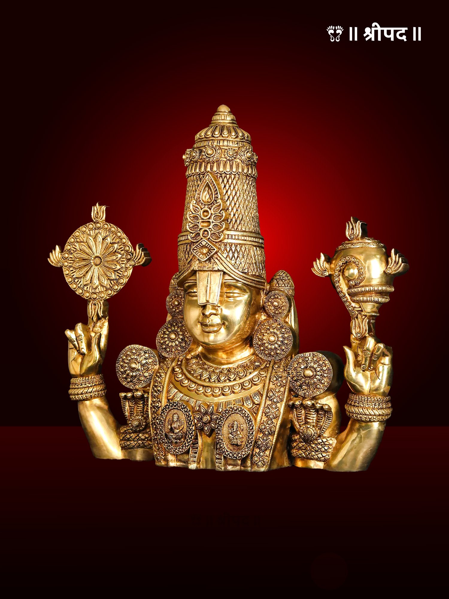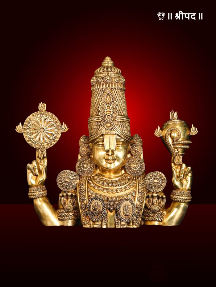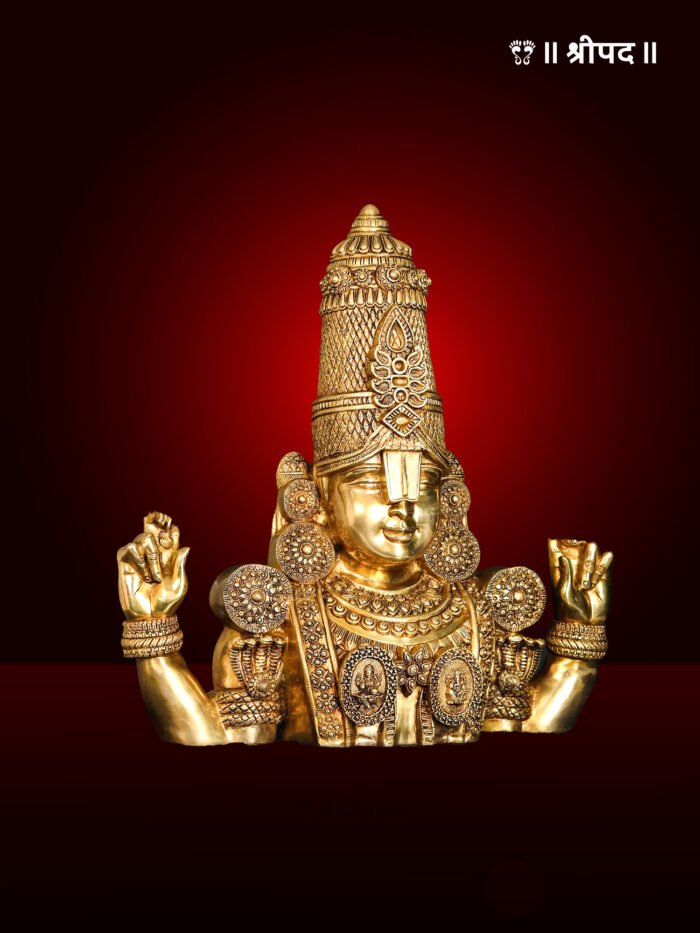 The 30-inch Large Tirupati Balaji (Venkateshvara) Bust Brass Statue is a majestic representation of Lord Venkateshvara, revered as the preserver and the embodiment of prosperity and spiritual grace. This dual-purpose statue, designed for both standing display and wall hanging, is a true masterpiece that blends divinity with exquisite artistry.