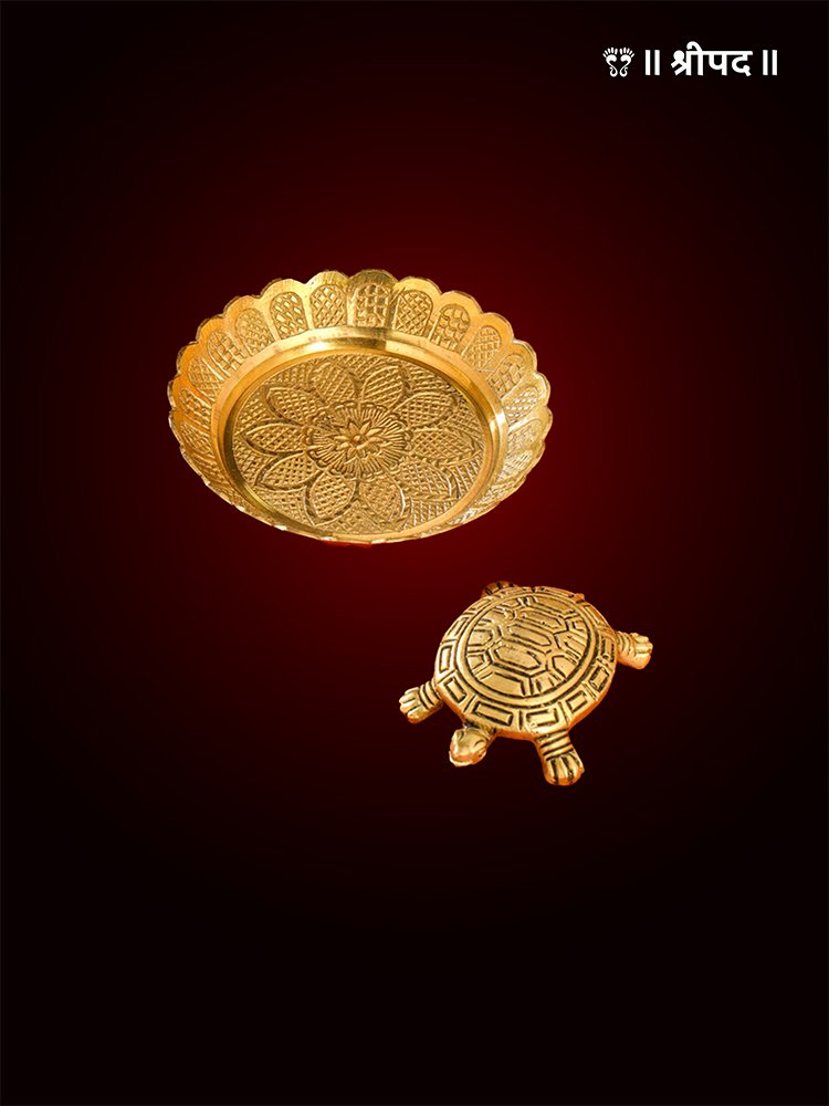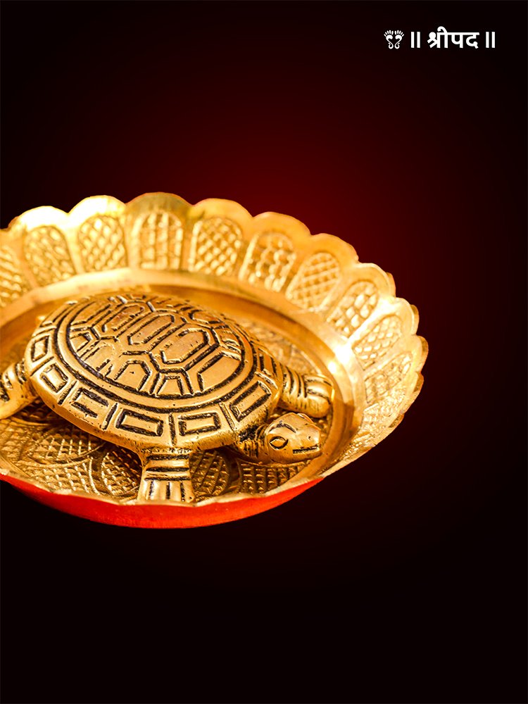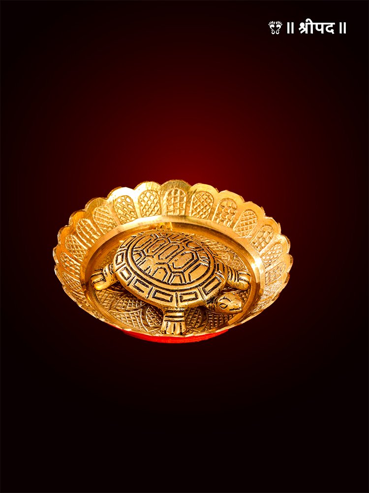 The Kamalasana Kurma Yantra (Tortoise with Plate) is a sacred symbol of sthirata (stability), dhan prapti (wealth acquisition), and vastu shuddhi (spiritual purification). Crafted from shuddha peetal (pure brass), this exquisite kurma murti (tortoise idol) sits gracefully on a kamal patra (lotus plate), representing prosperity and positive energy.