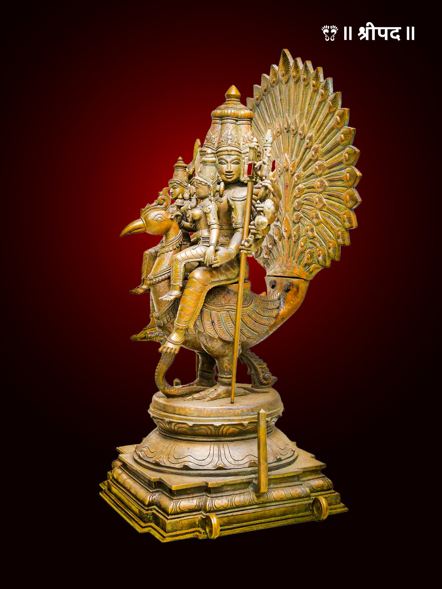 Twelve-Armed Shanmukha Murugan Seated on Peacock with Devasena and Valli | 34-Inch | Madhuchista Vidhana Panchaloha Bronze