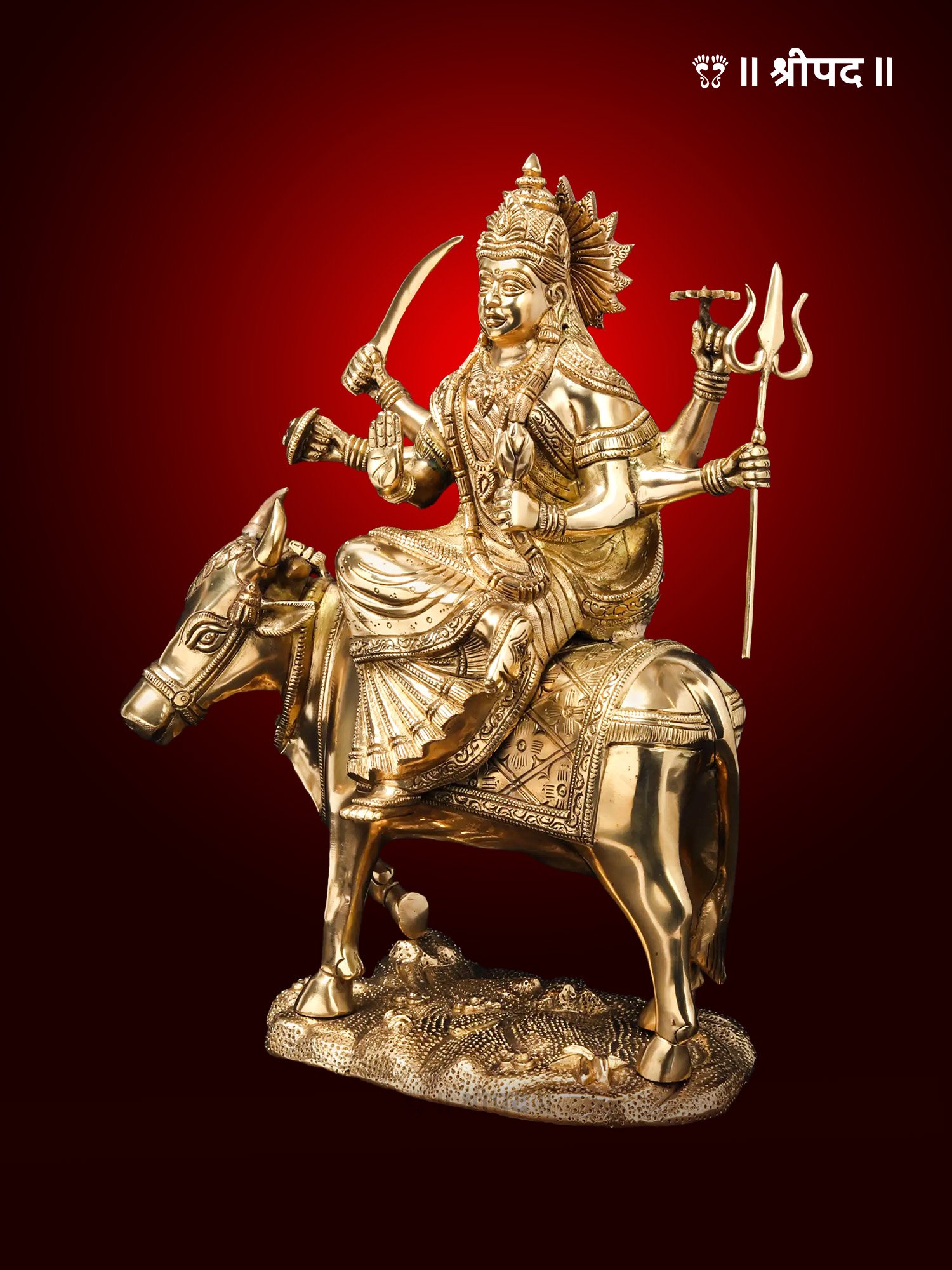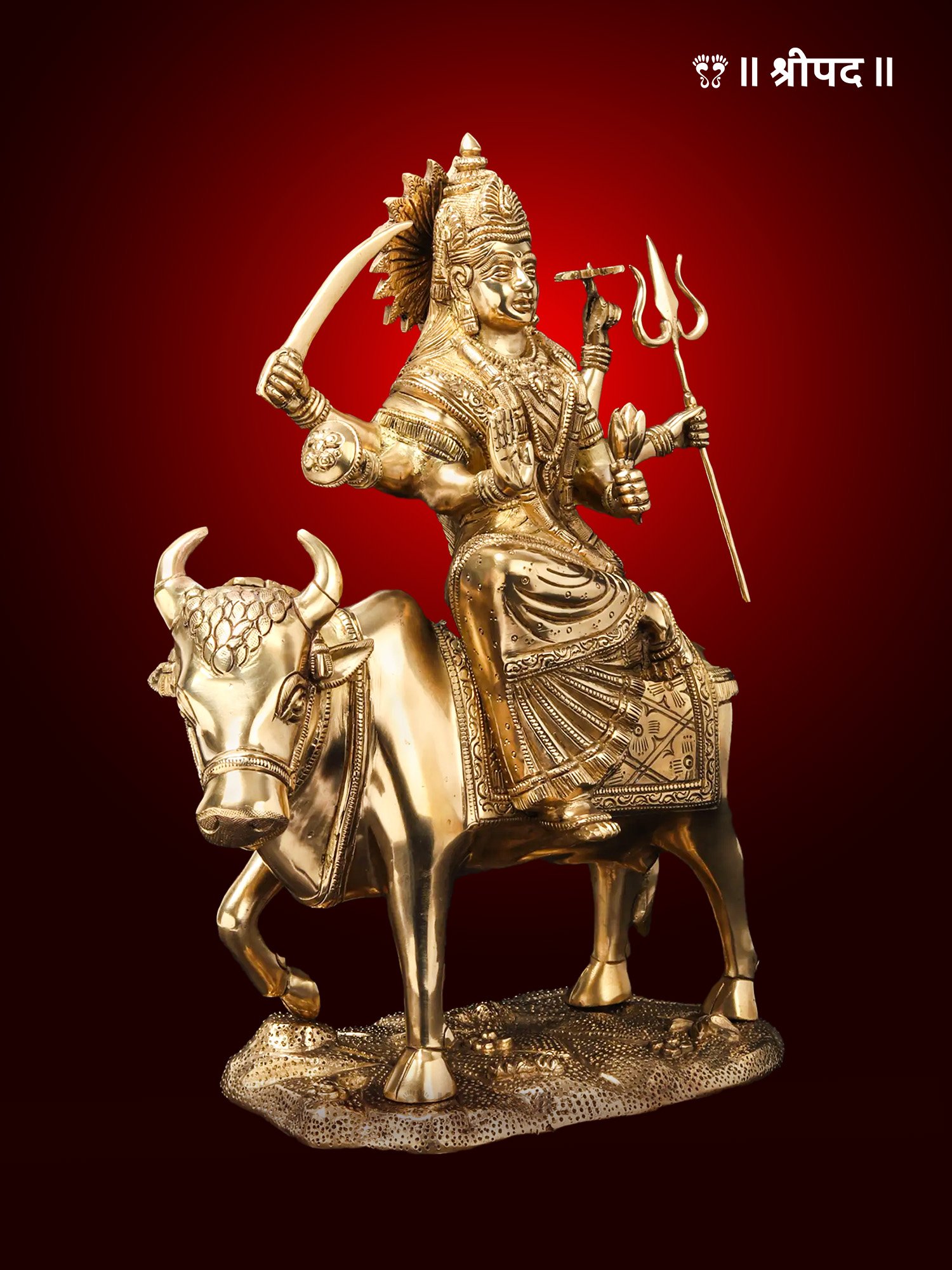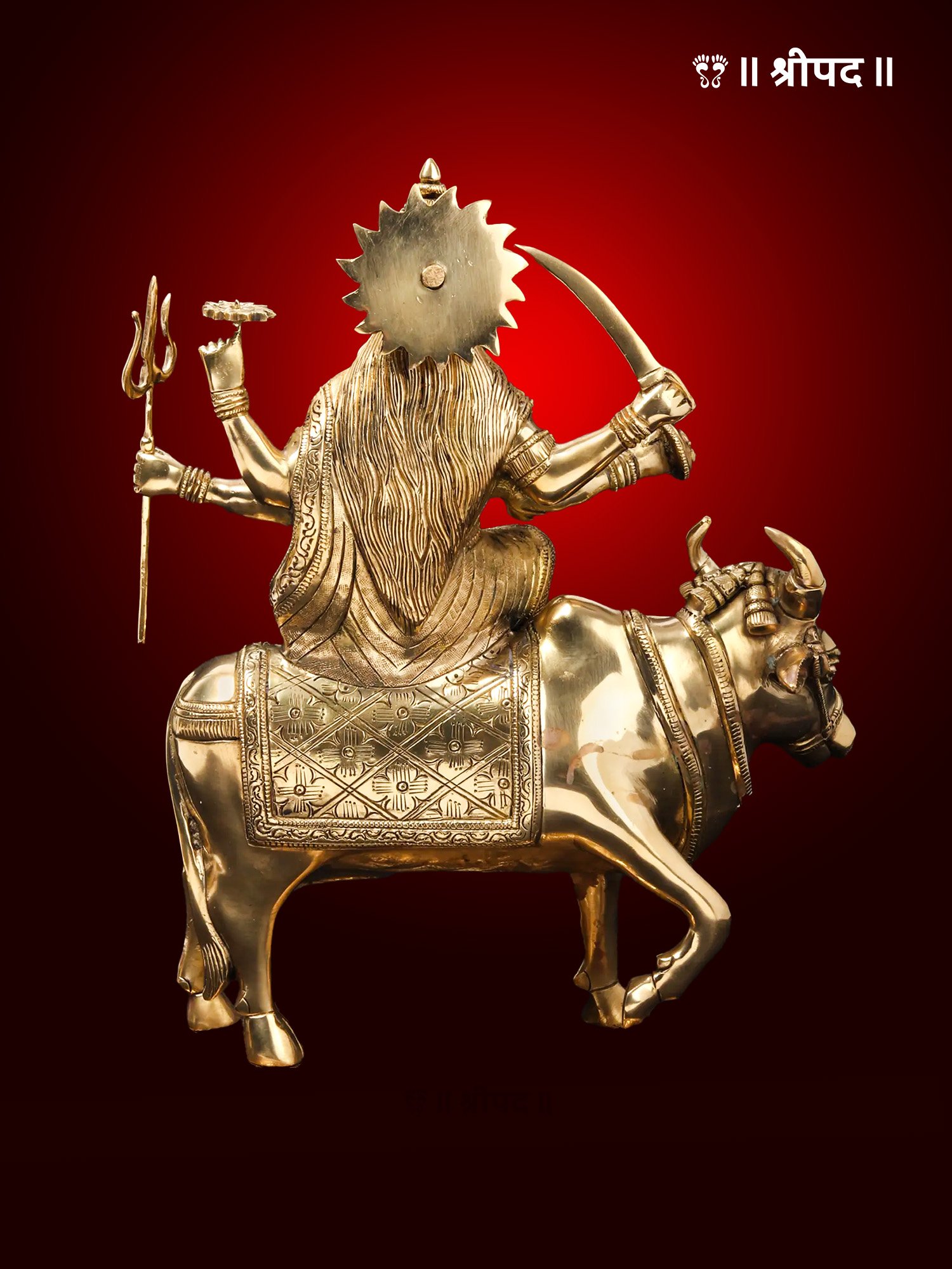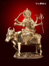 The brass statue of Umiyaa Mata seated gracefully on the back of a cow is a divine representation of the revered goddess in her benevolent and nurturing form. Umiyaa Mata, a manifestation of Goddess Parvati and the kuldevi (family deity) of the Kadva Patidar community, symbolizes love, strength, and prosperity. In this unique depiction, the goddess is seated atop a cow, which is considered sacred and a symbol of purity, abundance, and maternal care.