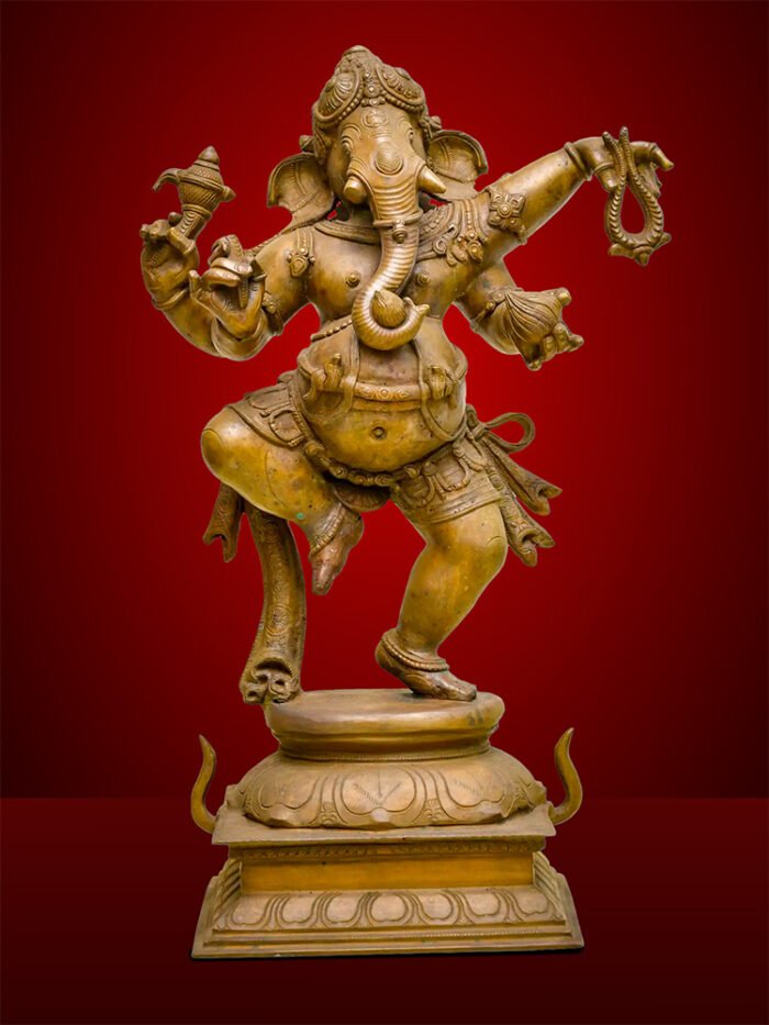 Celebrating his primordial aura and auspiciousness, Nritya Ganesha is a renowned example of the elegance and natural beauty captured in the Panchaloha bronzes of Swamimalai.