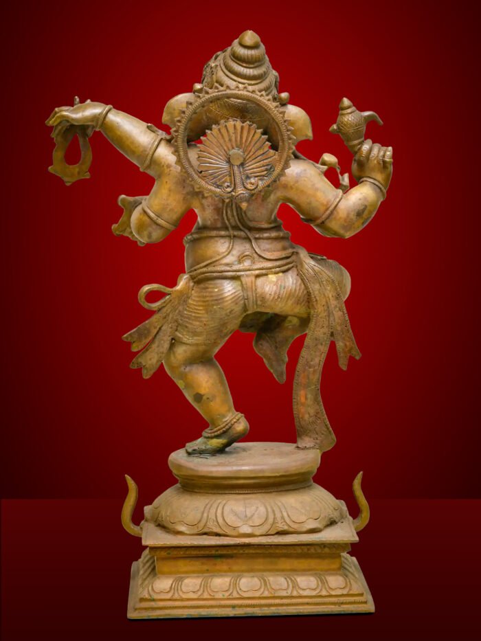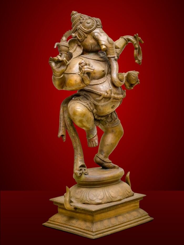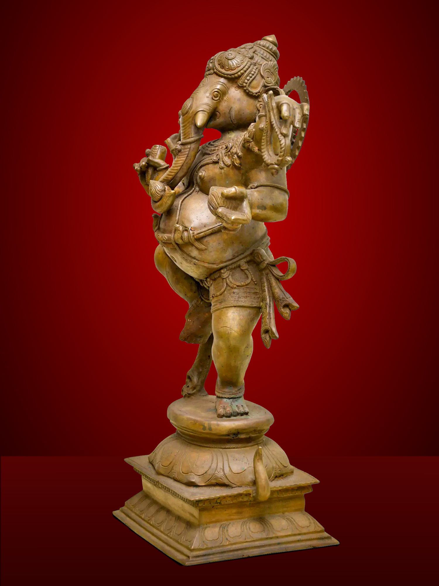 Every aspect of Nritya-Ganapati in this bronze is sculpted with masterful precision. The refined lines and polished finish lend a lifelike quality to the composition, making this a truly iconic Darshana of Ganesha.